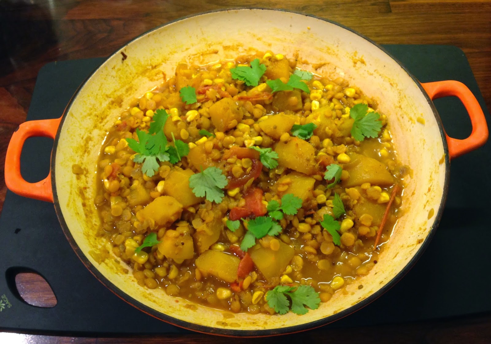 Soak peas in lukewarm water for 30-60mins. This will reduce the cooking time. Fry the garlic and ginger in the coconut oil. Add the onions and spices and continue to fry until onions are soft. Add tomatoes and continue to fry for a few minutes. Add pumpkin/squash, peas and vegetable stock. Simmer until the peas are cooked. (30-45mins).