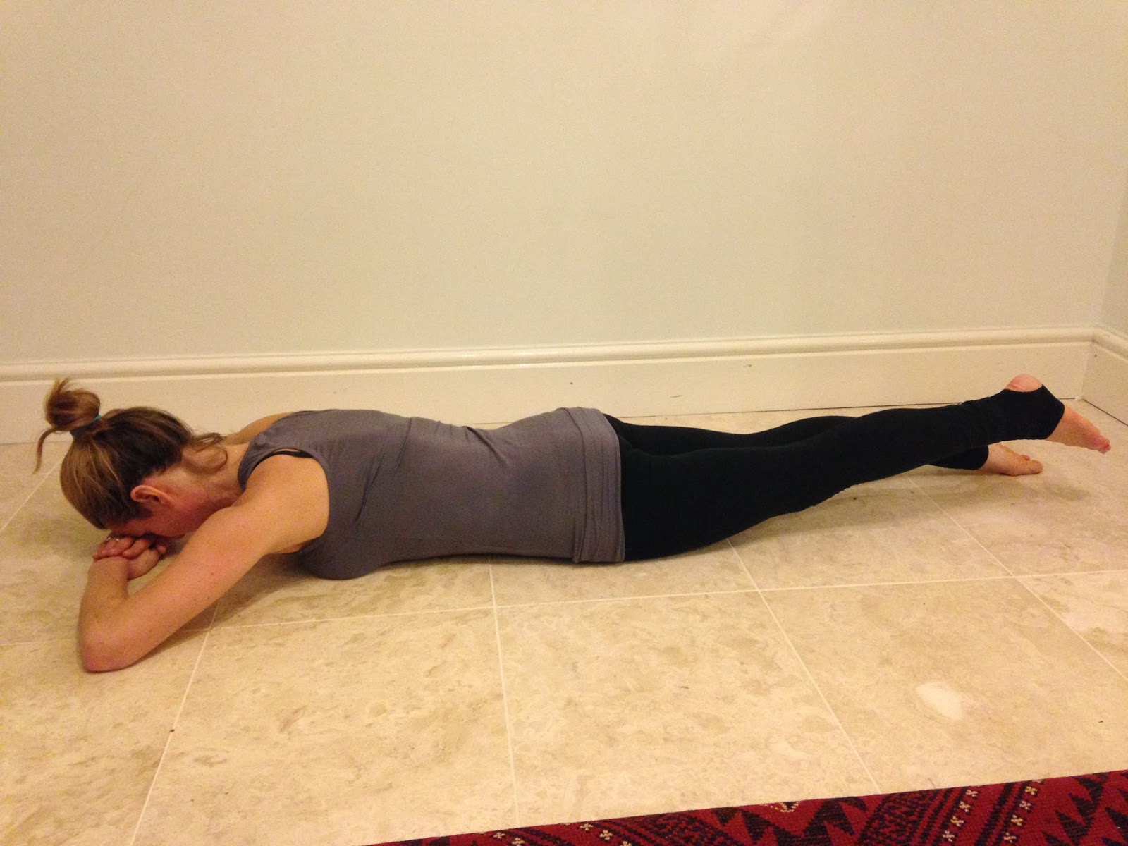 Gently send the pubic bone to the floor and lift the area between the pubic bone and the belly button away from the floor to activate the abdominal muscles. This will also help activate the glutes and support the spine. Exhale and lift and extend one leg. If you feel this more in your hamstrings, you are overusing these muscles and not the glutes. Don’t lift as high and focus in engaging the glutes before you lift the leg. This is also the case if you feel it in the lower back.