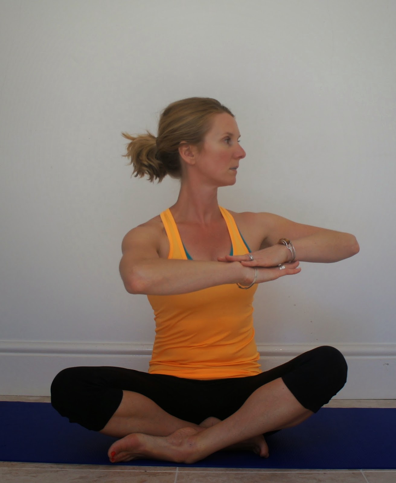Seated cross-legged or on a stability ball. Pelvis and spine in neutral, facing forward. Keep the chest open by gently contracting between the shoulder blades throughout the movement.