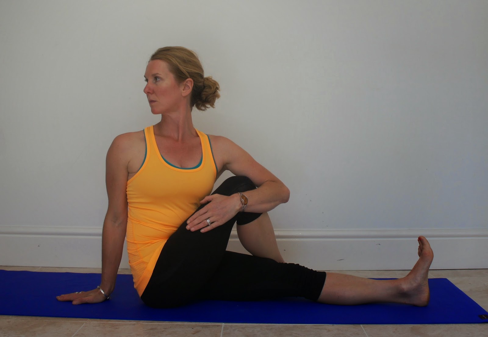 Allow the right knee to drop to the floor and gently lift the left knee. Keep the spine long and gently move right knee away from the body. Hold for 5 breaths.